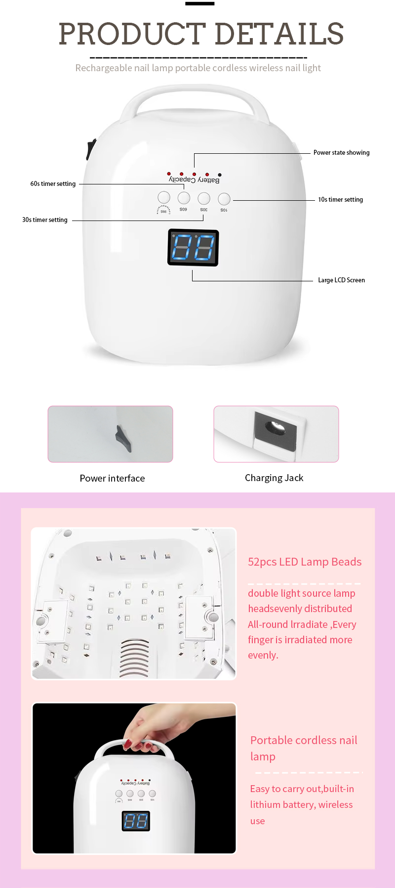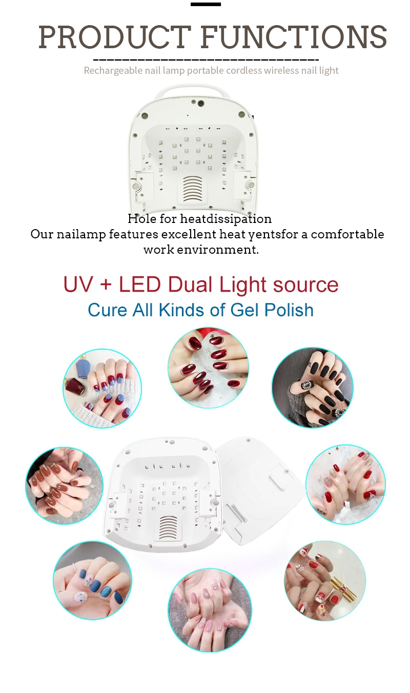 Produkt zaisťuje rovnomerné schnutie lepidla bez zmršťovania. Jeho dvojité svetelné zdroje poskytujú jemné zahrievanie, aby sa zabránilo zafarbeniu rúk a namáhaniu očí, vhodné pre ruky aj nohy a poskytujú pozoruhodne rýchle výsledky sušenia.