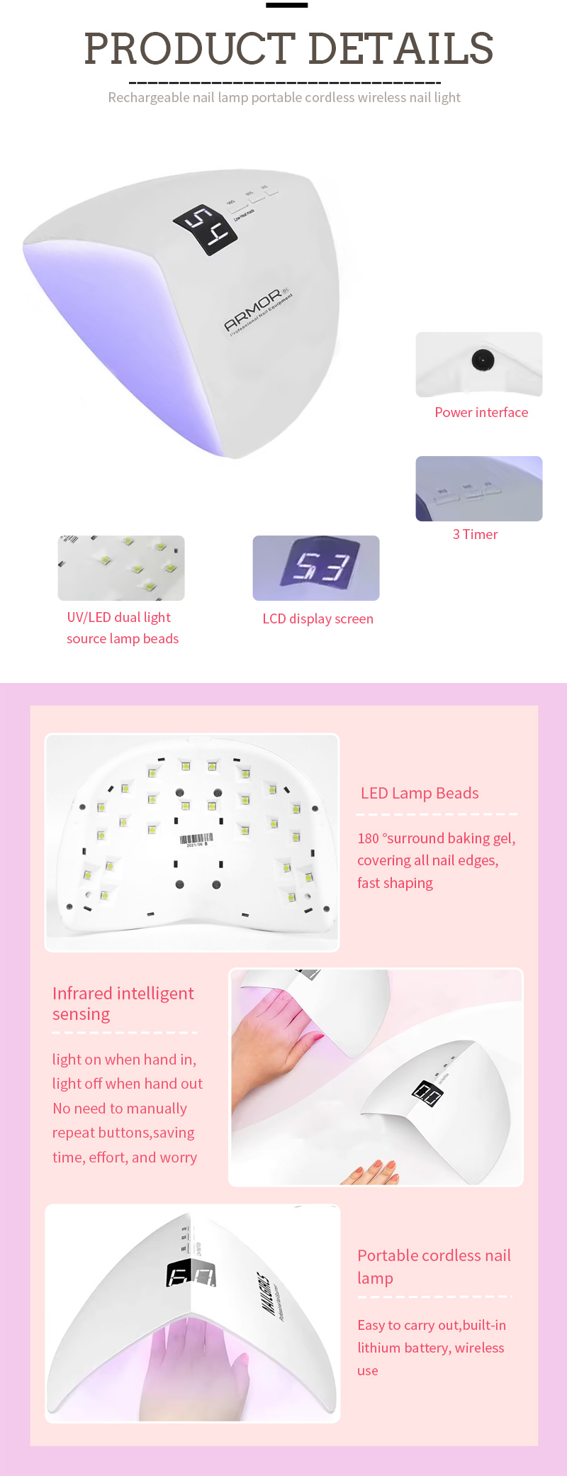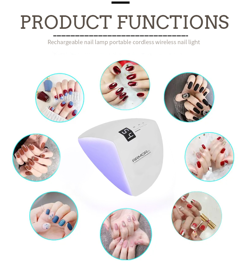 Produkt zaisťuje rovnomerné lepenie sušenia bez zmršťovania. Jeho duálne zdroje svetla poskytujú jemné zahrievanie, aby sa zabránilo sfarbeniu rúk a napätia očí, vhodné pre ruky aj nohy, čo prináša pozoruhodne rýchle sušenie výsledkov.