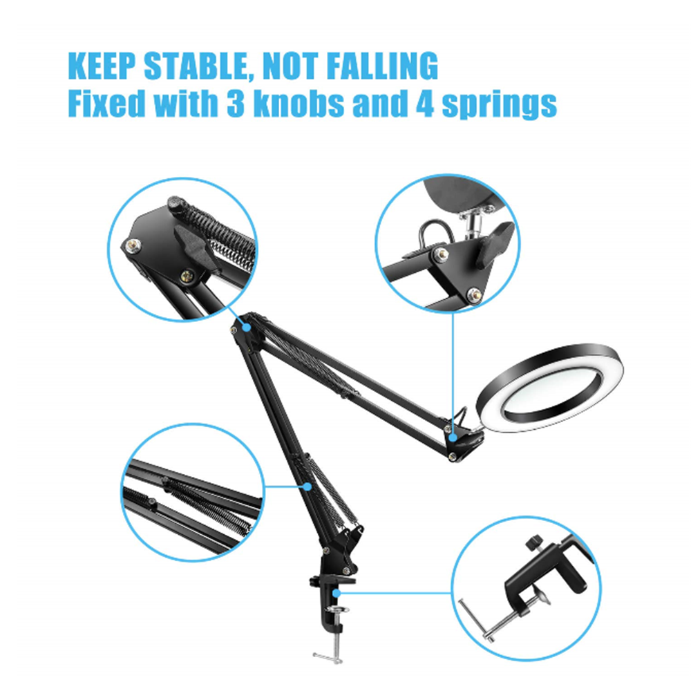 Táto skladacia zväčšovacia stolná lampa, otočná o 360 stupňov, má elegantný a rafinovaný dizajn. Jeho jemné svetlo je šetrné k očiam a simuluje mäkké, prirodzené svetlo úsvitu pre pohodlné osvetlenie bez oslnenia. Vhodné pre viaceré aplikácie vrátane tetovania, vyšívania a zdobenia nechtov.