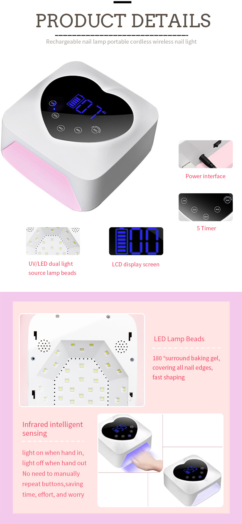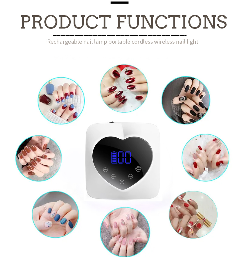 Produkt zaisťuje rovnomerné lepenie sušenia bez zmršťovania. Jeho duálne zdroje svetla poskytujú jemné zahrievanie, aby sa zabránilo sfarbeniu rúk a napätia očí, vhodné pre ruky aj nohy, čo prináša pozoruhodne rýchle sušenie výsledkov.