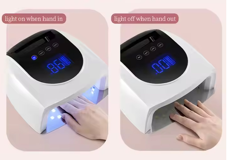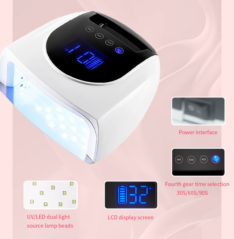 Produkt zaisťuje rovnomerné schnutie lepidla bez zmršťovania. Jeho dvojité svetelné zdroje poskytujú jemné zahrievanie, aby sa zabránilo zafarbeniu rúk a namáhaniu očí, vhodné pre ruky aj nohy a poskytujú pozoruhodne rýchle výsledky sušenia.