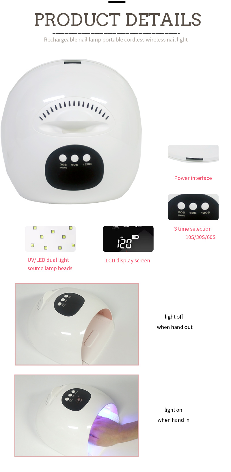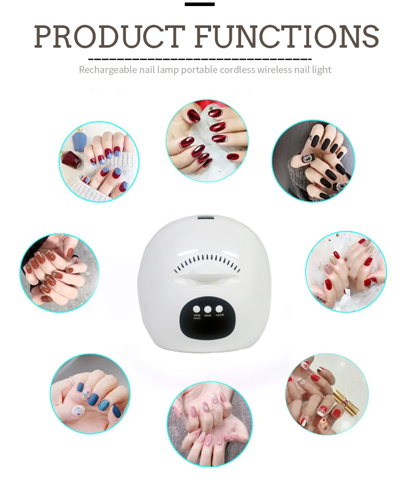 Produkt zaisťuje rovnomerné schnutie lepidla bez zmršťovania. Jeho dvojité svetelné zdroje poskytujú jemné zahrievanie, aby sa zabránilo zafarbeniu rúk a namáhaniu očí, vhodné pre ruky aj nohy a poskytujú pozoruhodne rýchle výsledky sušenia.