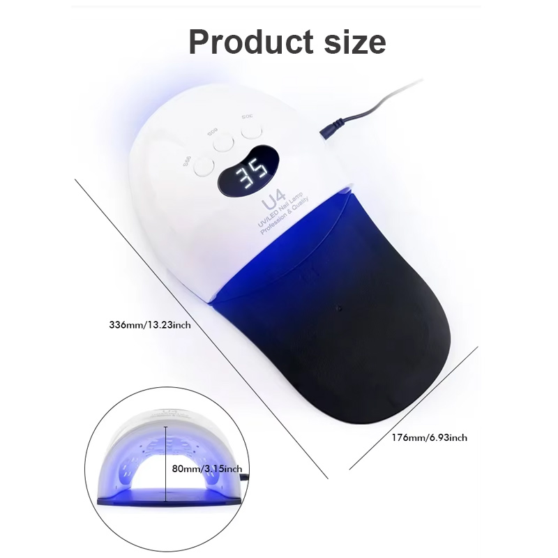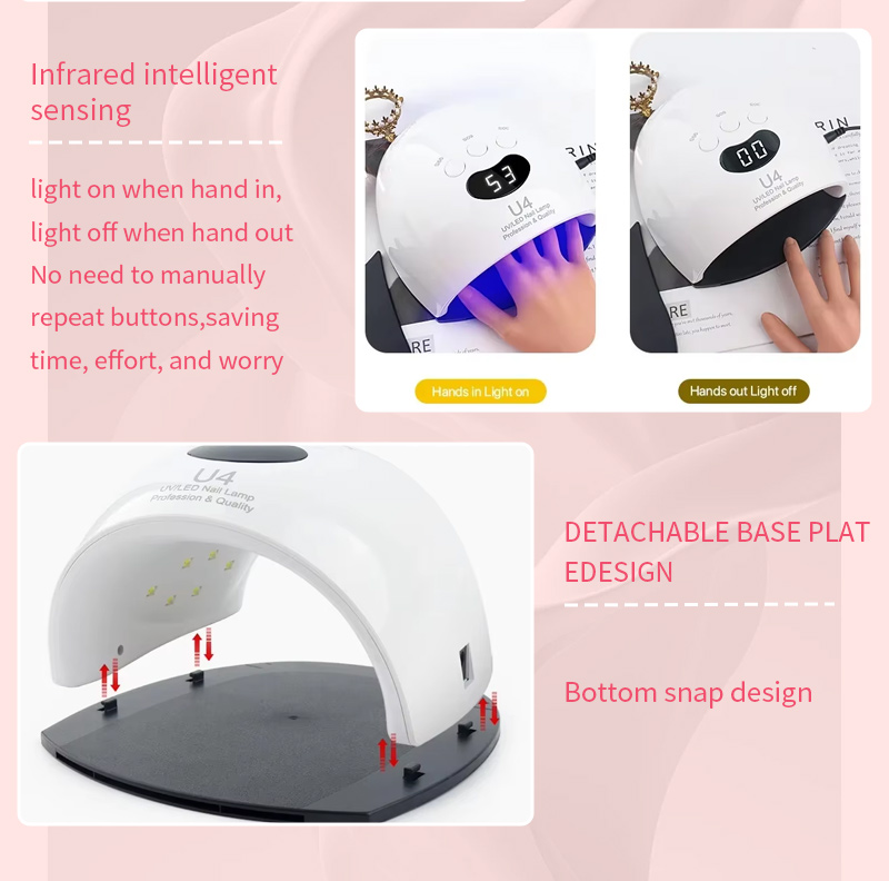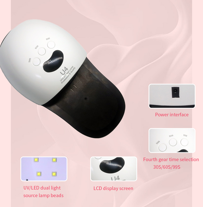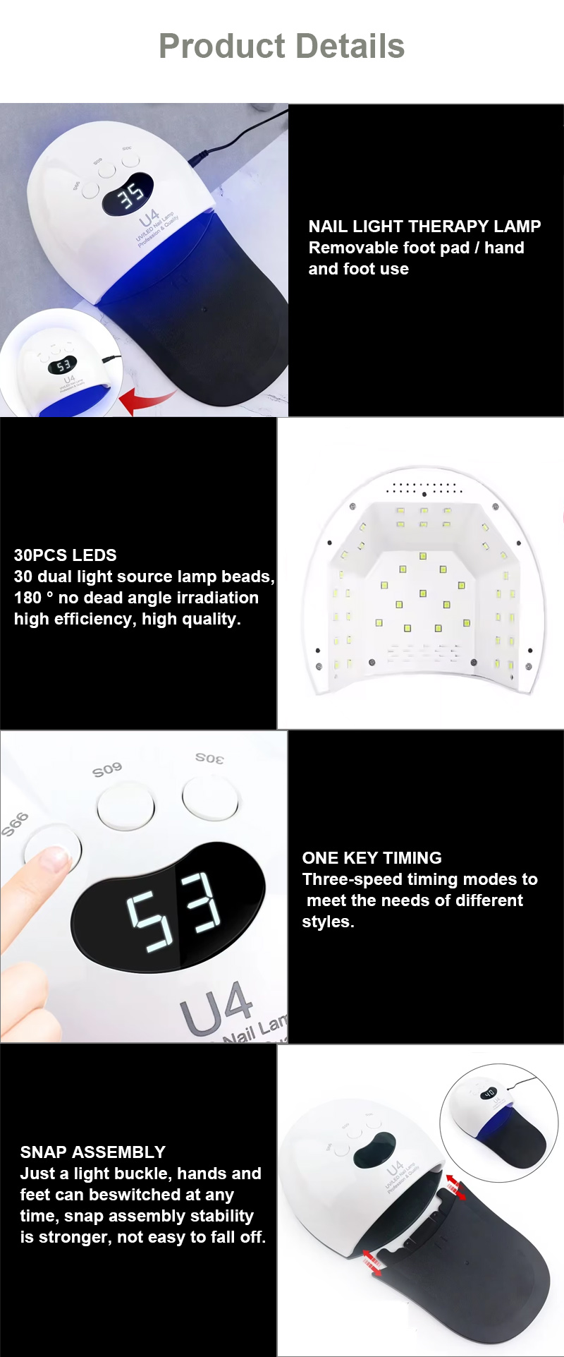 Táto vysokokvalitná LED lampa na sušenie nechtov zaisťuje rovnomerné zaschnutie lepidla bez krčenia. Jeho dvojité svetelné zdroje poskytujú jemné zahrievanie, aby sa zabránilo zafarbeniu rúk a namáhaniu očí, vhodné pre ruky aj nohy a poskytujú pozoruhodne rýchle výsledky sušenia.