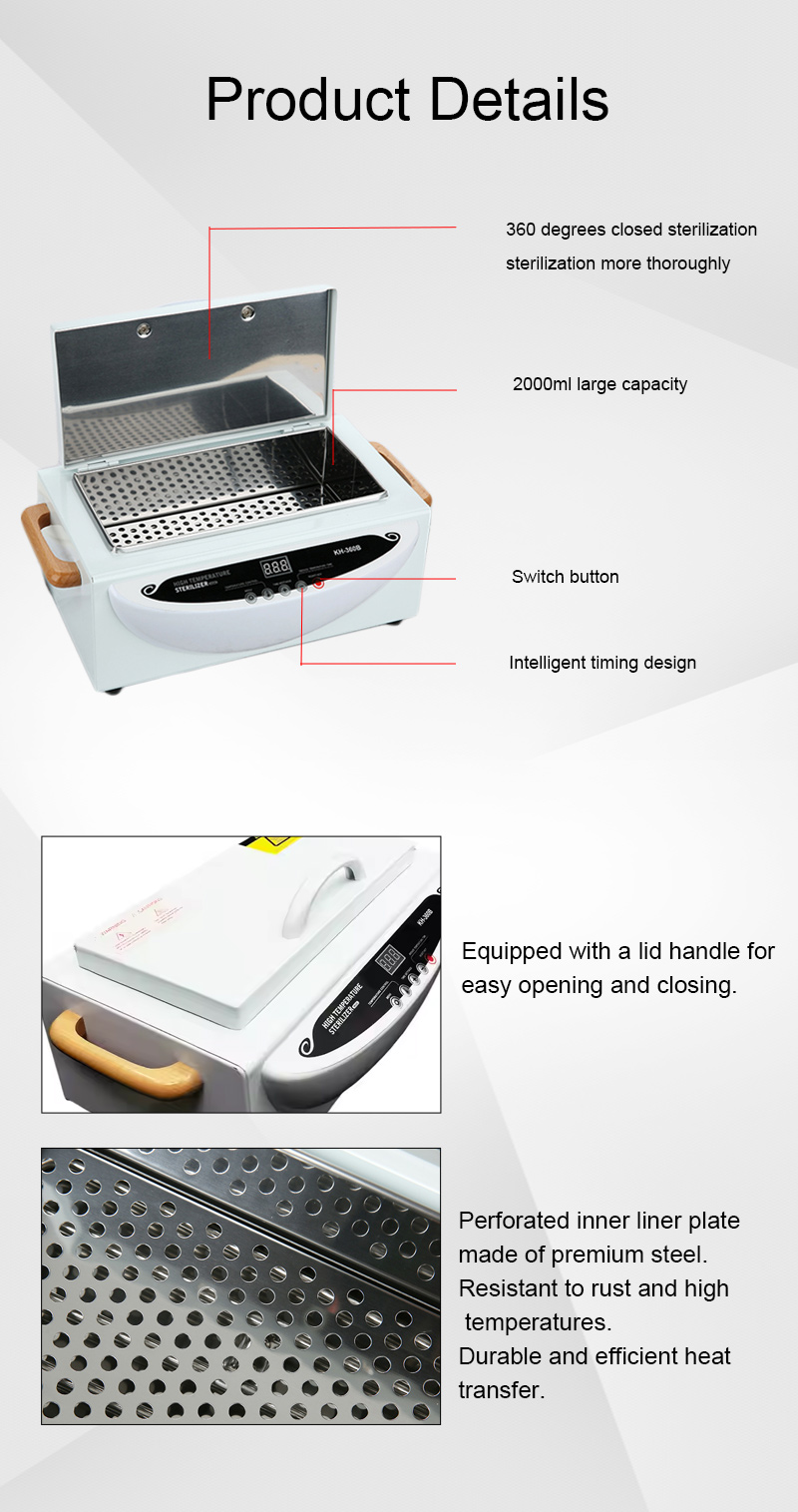 Tento sterilizátor primárne generuje teplo cez vyhrievací prstenec, pričom na dezinfekciu využíva vysoké teploty.