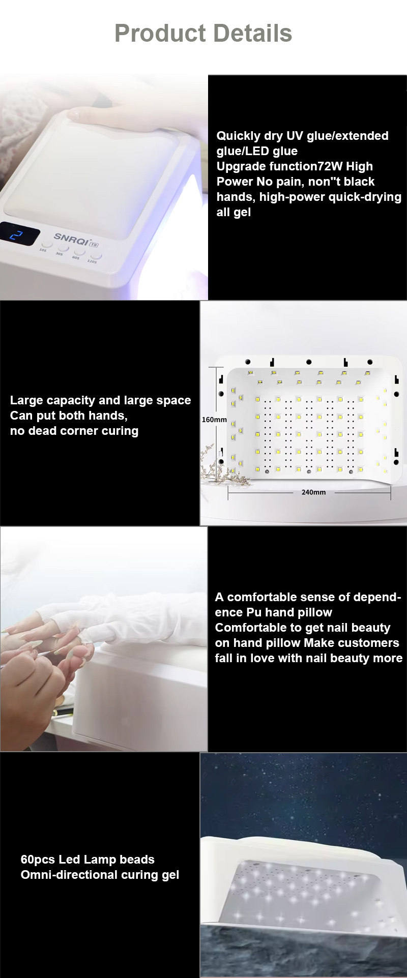 Produkt zaisťuje rovnomerné schnutie lepidla bez zmršťovania. Jeho dvojité svetelné zdroje poskytujú jemné zahrievanie, aby sa zabránilo zafarbeniu rúk a namáhaniu očí, vhodné pre ruky aj nohy a poskytujú pozoruhodne rýchle výsledky sušenia.