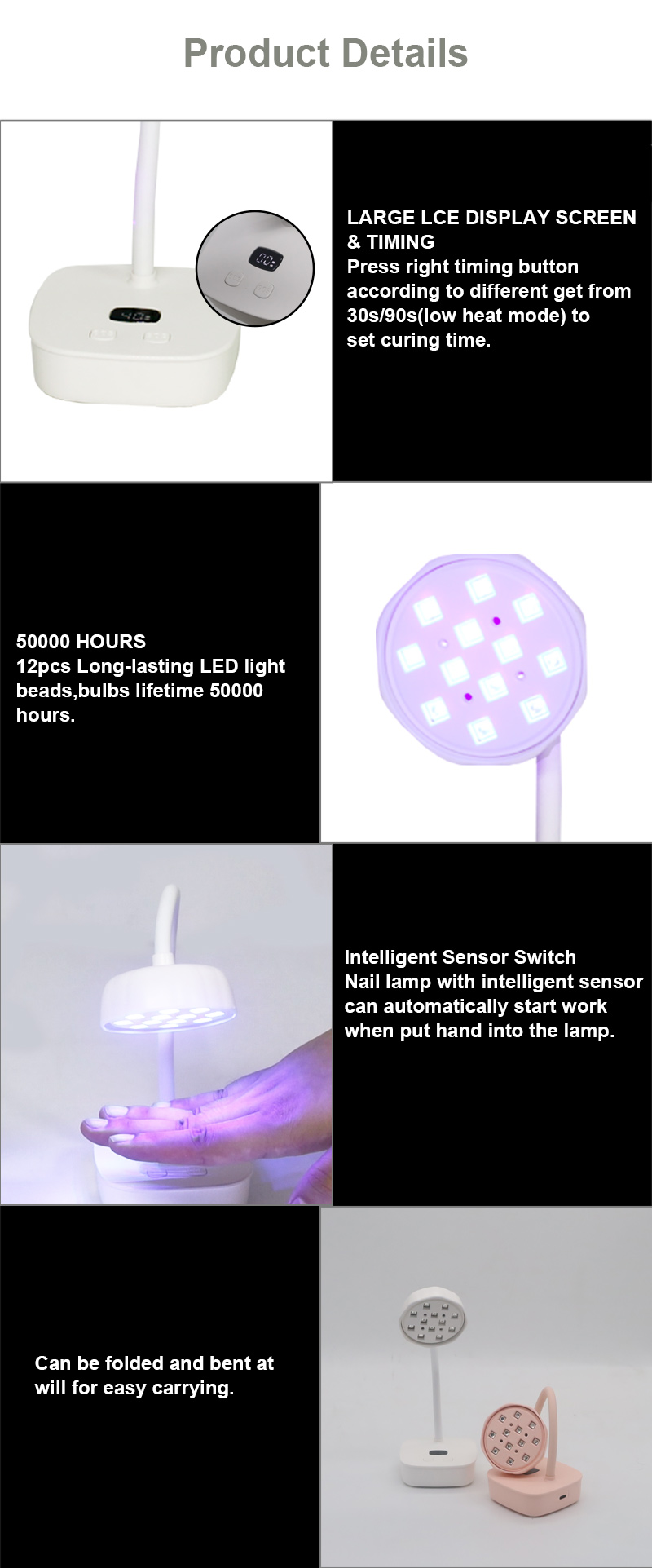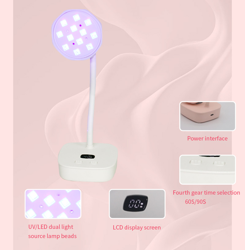 Produkt zaisťuje rovnomerné schnutie lepidla bez zmršťovania. Jeho dvojité svetelné zdroje poskytujú jemné zahrievanie, aby sa zabránilo zafarbeniu rúk a namáhaniu očí, vhodné pre ruky aj nohy a poskytujú pozoruhodne rýchle výsledky sušenia.