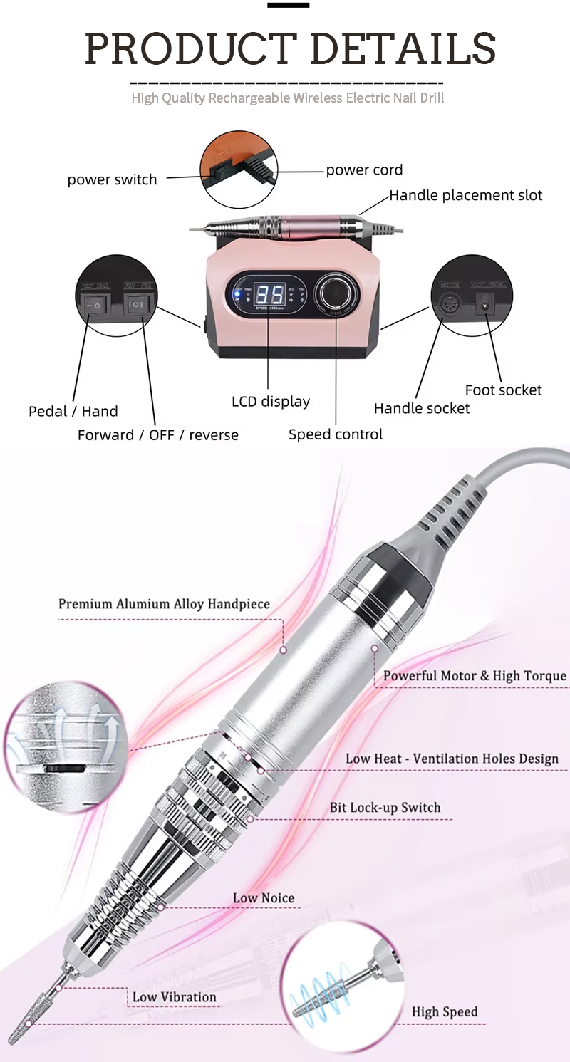 Prenosná súprava vŕtačiek na nechty elektrická s výkonným motorom 65 W 35 000 ot./min