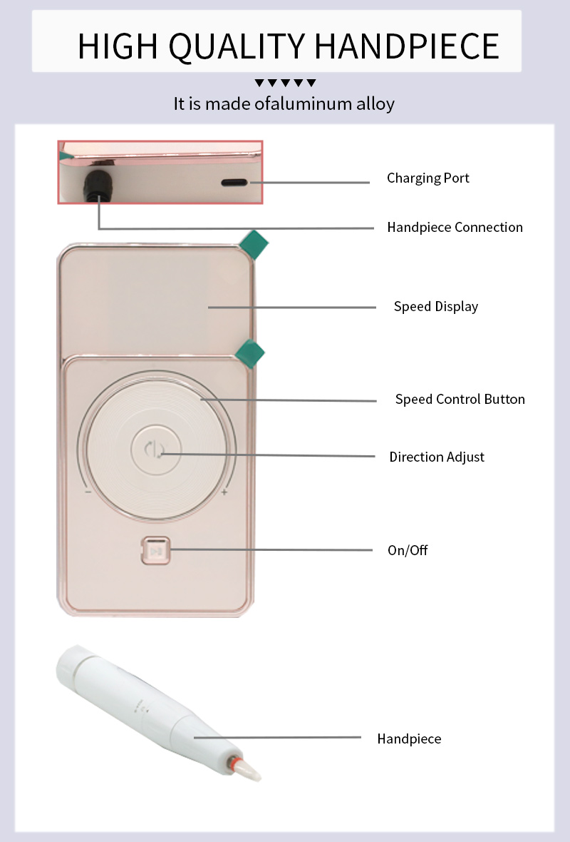 Tento dizajn vysokorýchlostného displeja s nízkou hlučnosťou brúsneho pera, so zásuvkou na brúsne pero, LCD displej z tekutých kryštálov môže zobrazovať počet otáčok / výkon / smer, gombík na prepínanie rýchlosti, prepínacie tlačidlo v smere hodinových ručičiek / proti smeru hodinových ručičiek, tlačidlo pauzy, profesionálny motor 30 000 otáčok za minútu, skrutkovacia uzamykacia brúsna hlava.