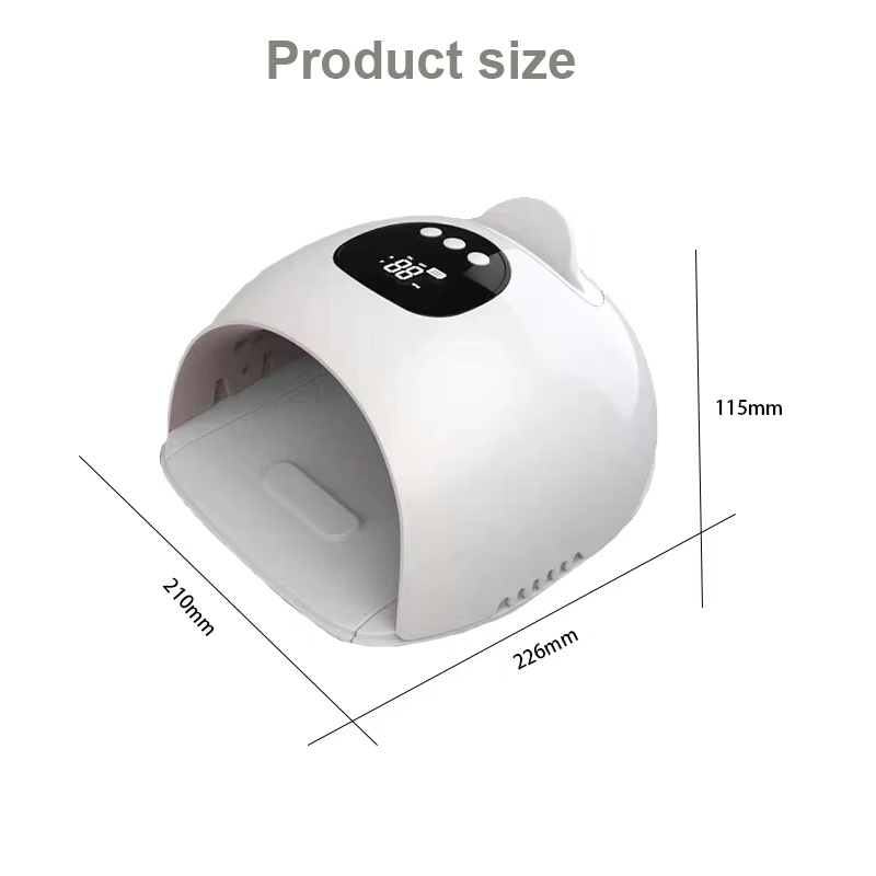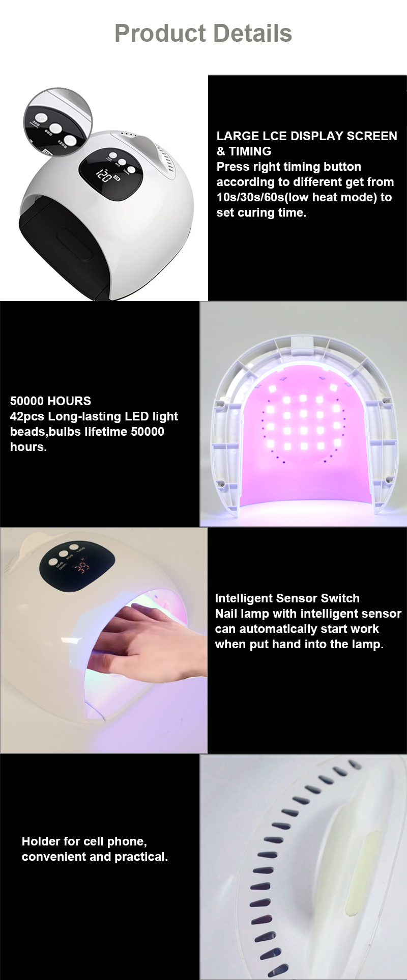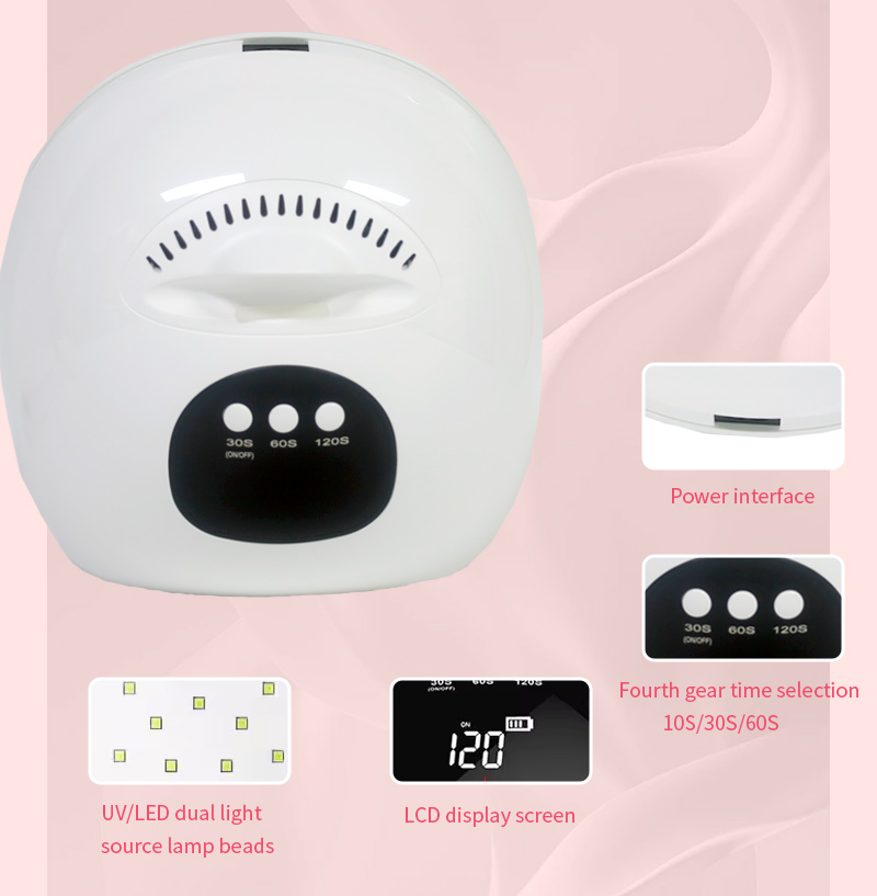 Produkt zaisťuje rovnomerné schnutie lepidla bez zmršťovania. Jeho dvojité svetelné zdroje poskytujú jemné zahrievanie, aby sa zabránilo zafarbeniu rúk a namáhaniu očí, vhodné pre ruky aj nohy a poskytujú pozoruhodne rýchle výsledky sušenia.