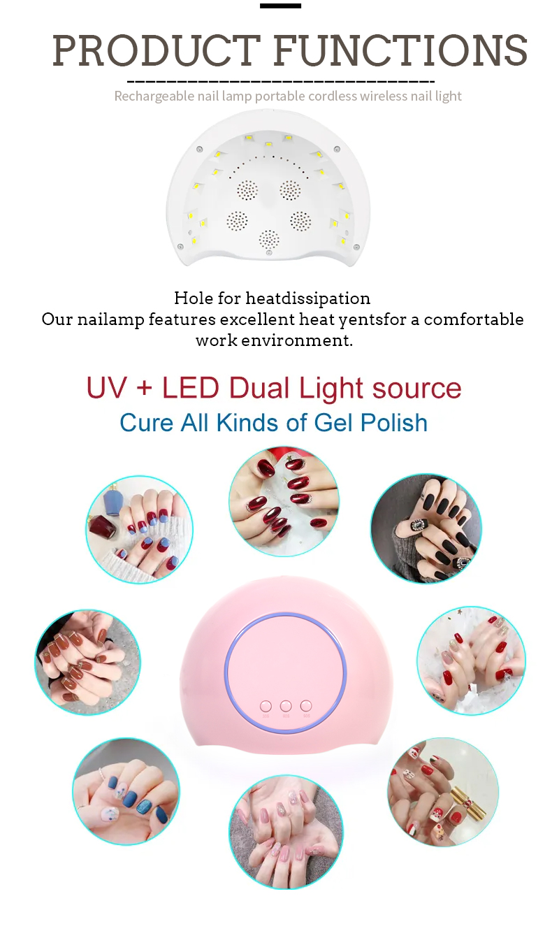 Produkt zaisťuje rovnomerné lepenie sušenia bez zmršťovania. Jeho duálne zdroje svetla poskytujú jemné zahrievanie, aby sa zabránilo sfarbeniu rúk a napätia očí, vhodné pre ruky aj nohy, čo prináša pozoruhodne rýchle sušenie výsledkov.