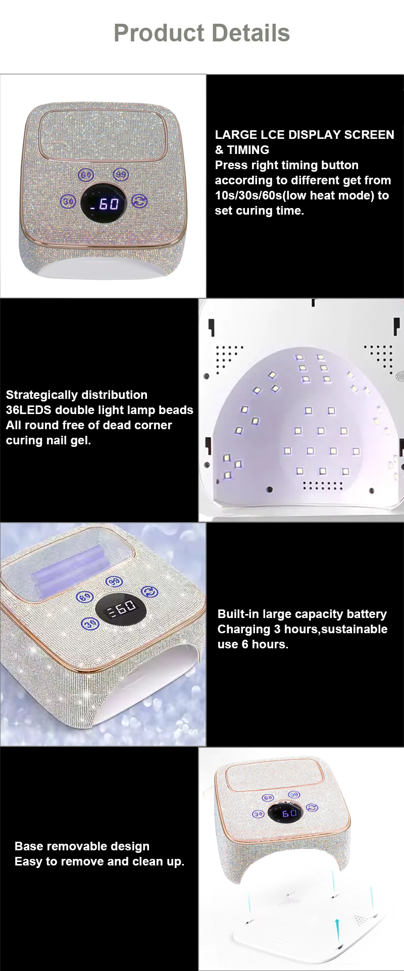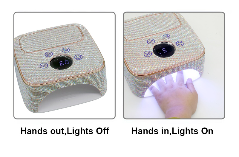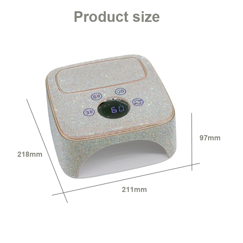 Produkt zaisťuje rovnomerné schnutie lepidla bez zmršťovania. Jeho dvojité svetelné zdroje poskytujú jemné zahrievanie, aby sa zabránilo zafarbeniu rúk a namáhaniu očí, vhodné pre ruky aj nohy a poskytujú pozoruhodne rýchle výsledky sušenia.
