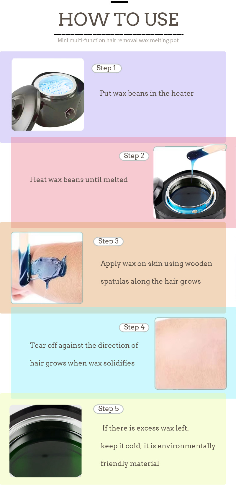 Spôsob prevádzky prípravku s depilačným voskom, čím vyššia teplota, tým rýchlejšie sa vosk topí, čím nižšia teplota, tým pomalšie sa vosk topí, najskôr nasypte do primeraného množstva zrniek depilačného vosku, zahrievajte, kým sa zrnká vosku neroztopia, potom depilačné časti rovnomerne natretého depilačného vosku a nakoniec proti smeru rastu chĺpkov odtrhnite.