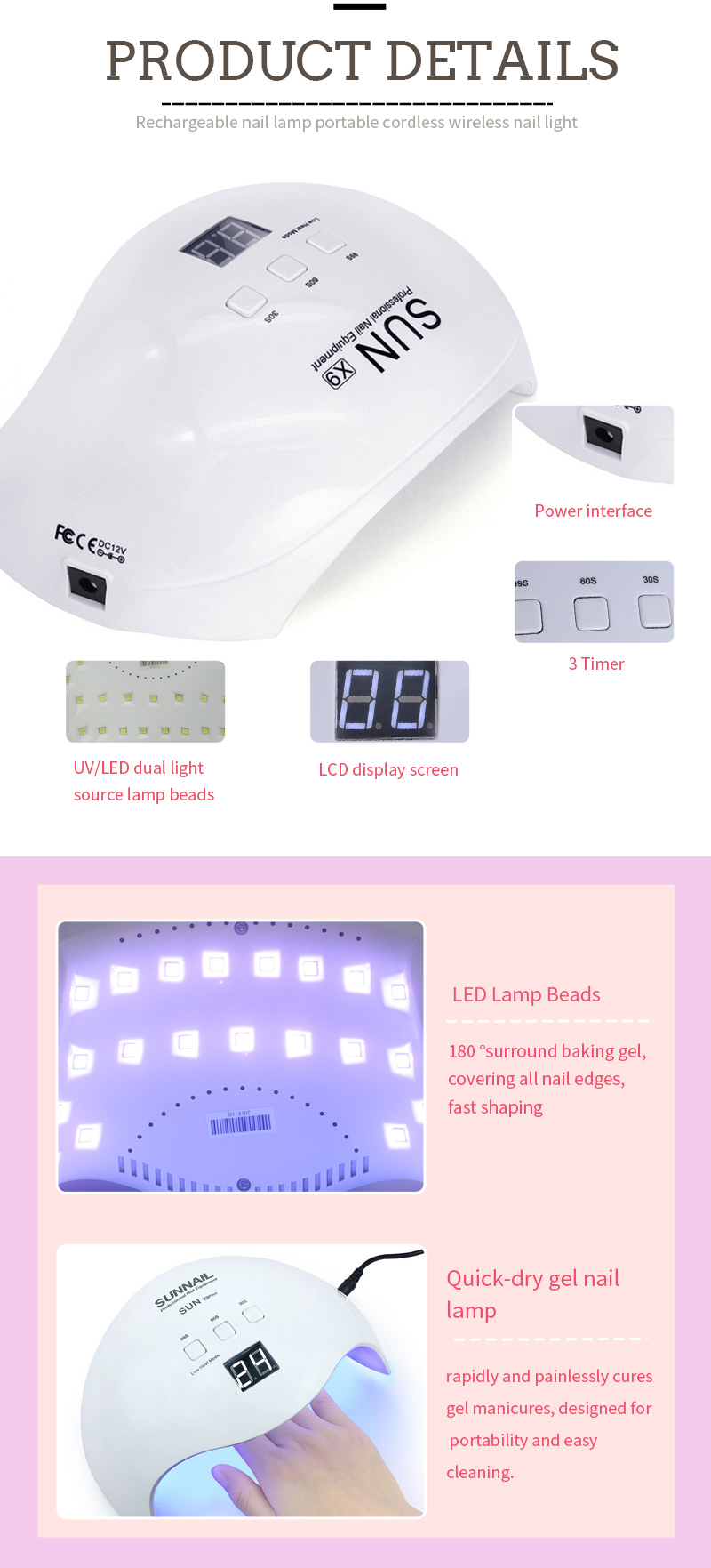 Produkt zaisťuje rovnomerné lepenie sušenia bez zmršťovania. Jeho duálne zdroje svetla poskytujú jemné zahrievanie, aby sa zabránilo sfarbeniu rúk a napätia očí, vhodné pre ruky aj nohy, čo prináša pozoruhodne rýchle sušenie výsledkov.