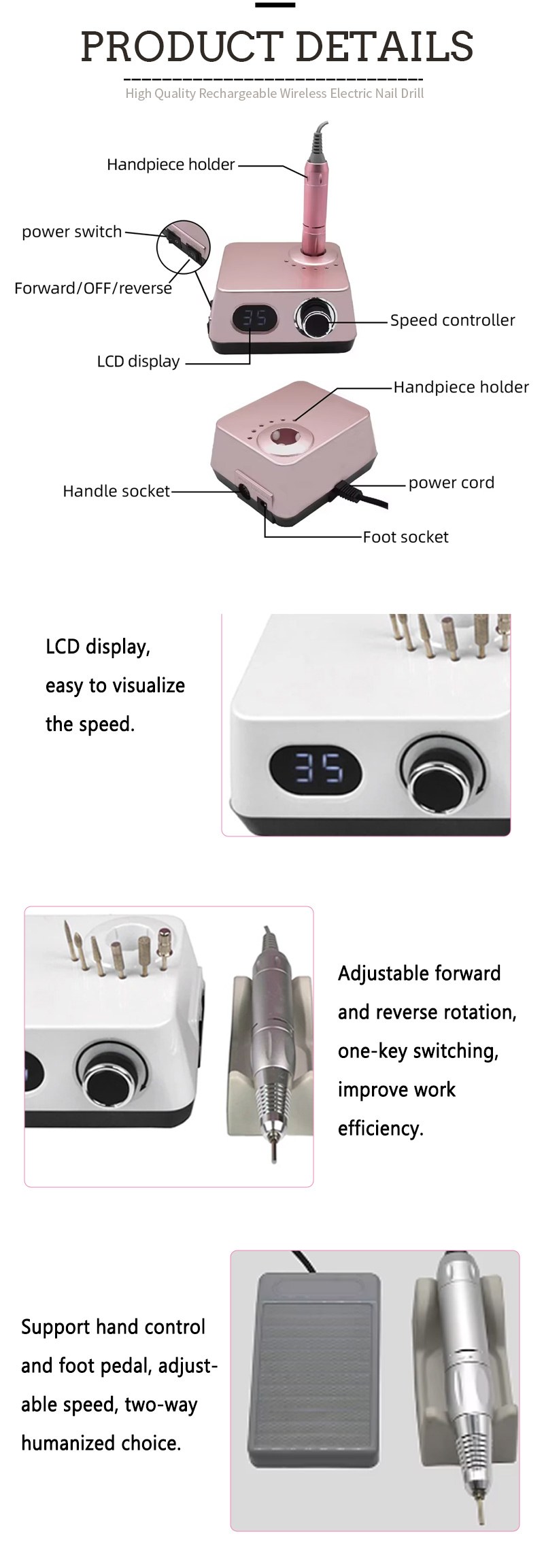 Dizajn displeja tejto bezdrôtovej elektrickej vŕtačky na nechty s 35 000 otáčkami za minútu má vypínač zapnutia/vypnutia a otáčanie dopredu/dozadu pre celkovú aktiváciu jedným tlačidlom, zásuvku na rýchle nabíjanie v spodnej časti, vymeniteľnú zásuvku na vŕtanie v hornej časti a trojpolohovú nastaviteľnú rýchlosť pre splnenie rôznych potrieb.